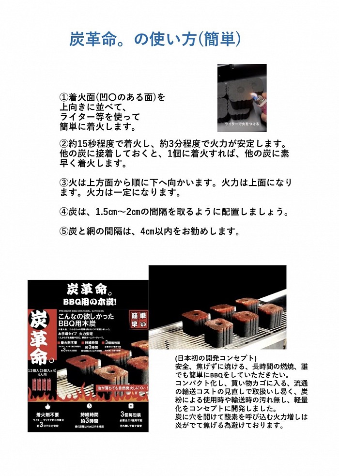 炭革命。BBQ用木炭12個入。数秒着火、3時間燃焼。バーベキューを少人数で簡単に!アウトドアや自宅バーベキューに最適。個包装だからできる→魚釣りで手を温める、登山や非常用リュックに。個包装の木炭で、炭粉はほぼ無し。長時間の燃焼。途中で火の調整不要。